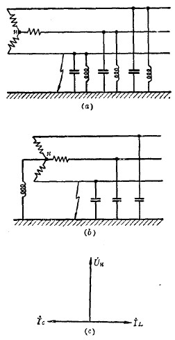 由于上述原因,這種補償方式在實際上是幷不采用的,但是用它來和接在中性點上的消弧線圈(圖b)作比較,將有助于更清楚地顯示后一種補償方式的優(yōu)越性。